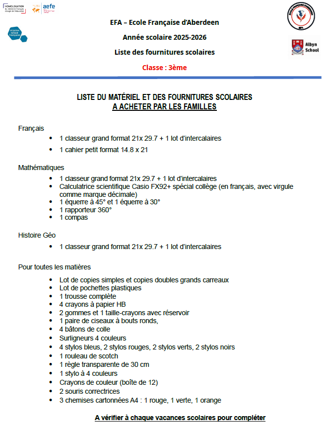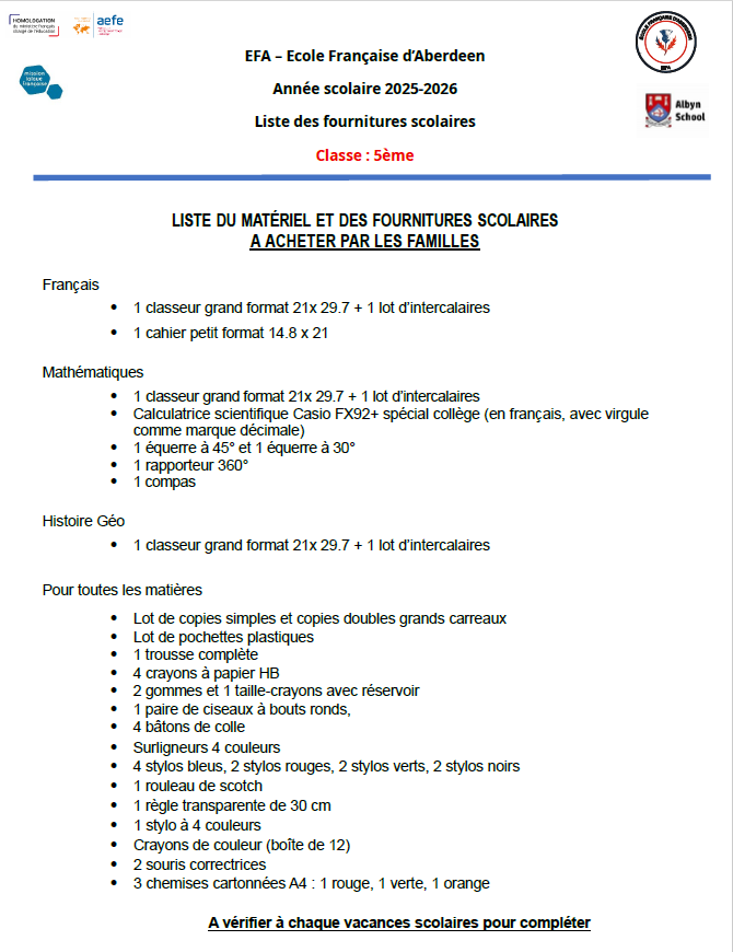 Fournitures scolaires 2024 – 2025