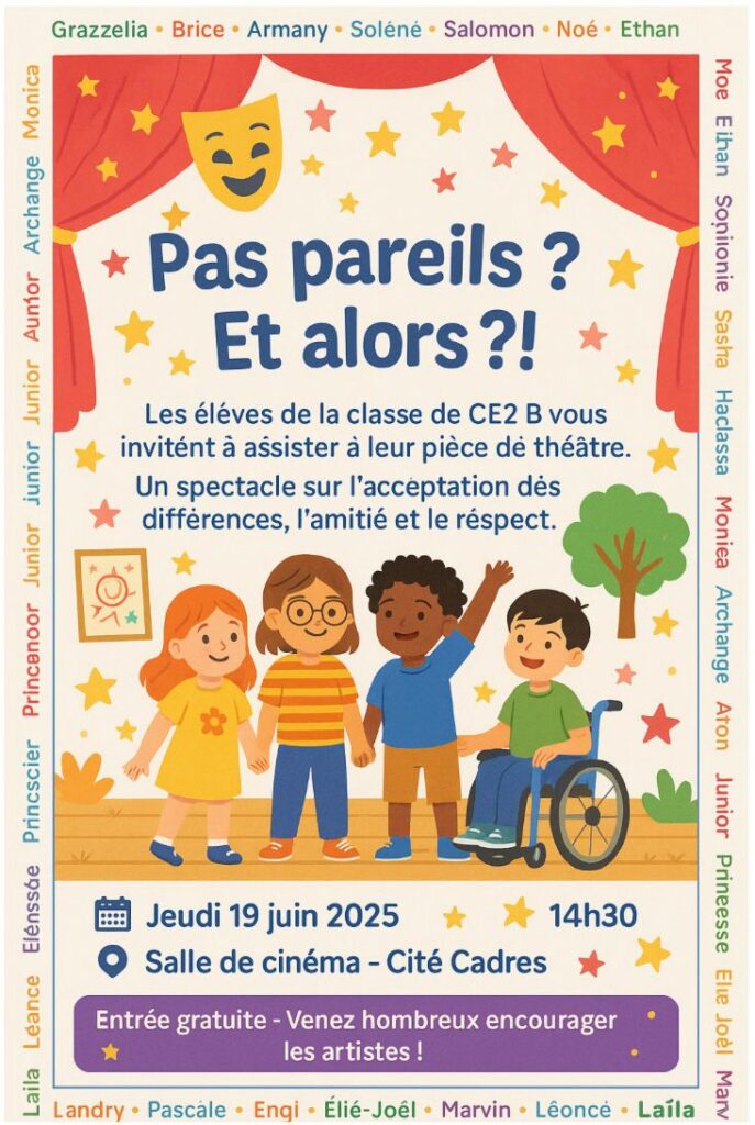Cette annĂ©e, j’ai eu le plaisir d’Ă©crire une pièce de théâtre spĂ©cialement conçue pour mes Ă©lèves de CE2. Ce projet a Ă©tĂ© pensĂ© en lien avec les grands thèmes que nous avons abordĂ©s tout au long de l’annĂ©e : l’acceptation des diffĂ©rences, la lutte contre le harcèlement scolaire et la tolĂ©rance.
