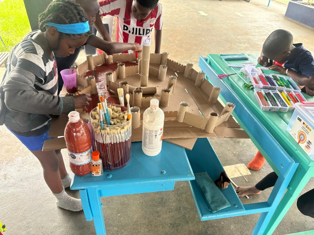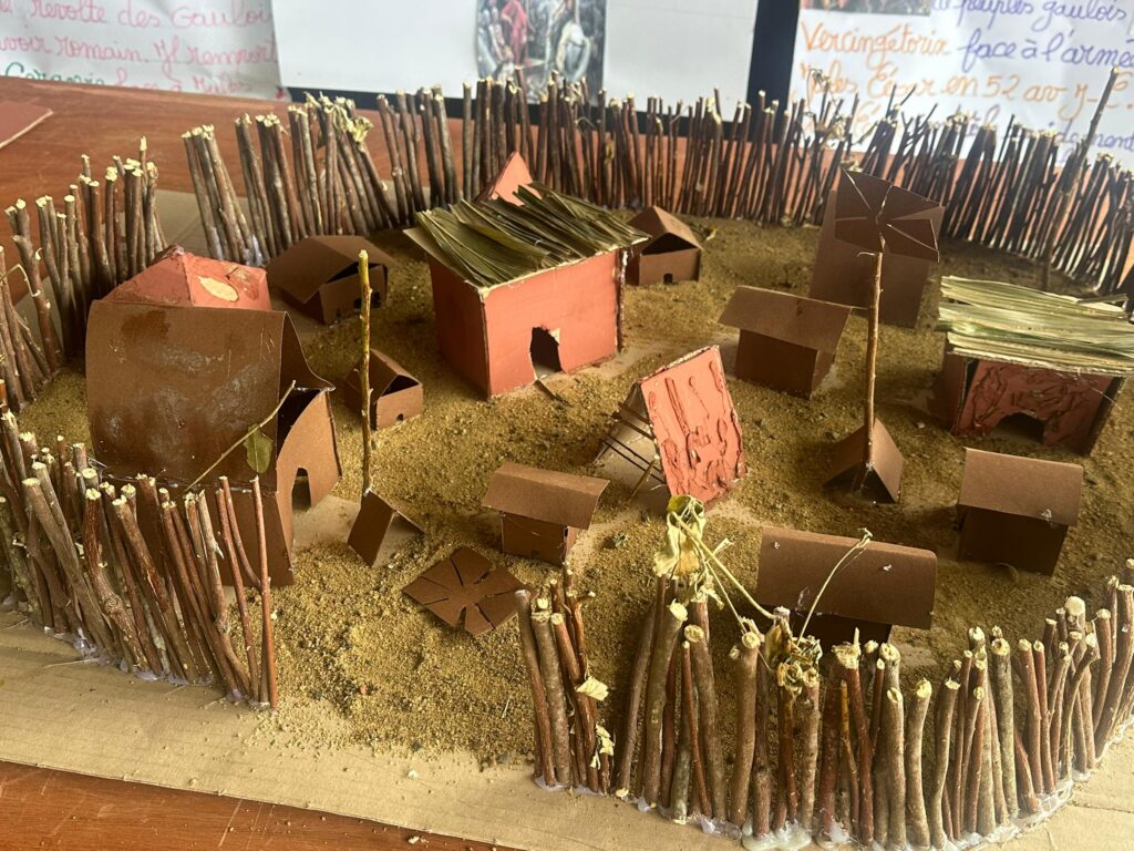 Ils ont ensuite recréé un village gaulois traditionnel, composé de cabanes en bois et en chaume et d’espaces de vie communautaires. Ce projet a été l’occasion d’explorer les coutumes, métiers et traditions des Gaulois, tout en favorisant le travail en équipe et la créativité.
