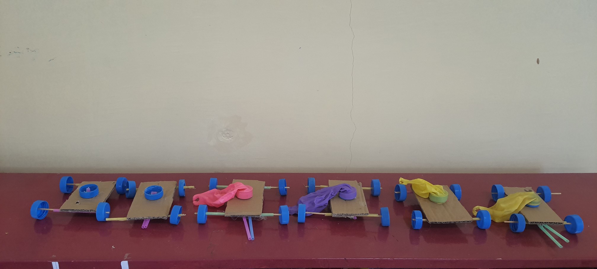Cette période, les élèves de CM2 des différentes classes ont participé à un projet de construction technique : imaginer et fabriquer une voiture capable d’avancer. Pour cela, ils disposaient tous du même matériel : bouteilles en plastique, bouchons,
