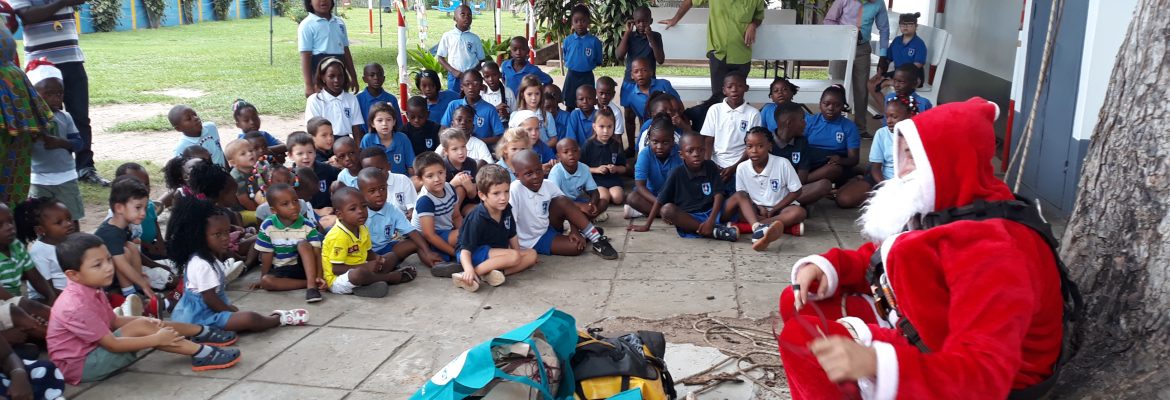 Qui est ce personnage en haut de l’arbre? C’est le Père Noël dont le traîneau s’est coincé dans les branches du badamier de la cour de l’école!