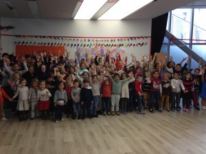 Et puis, vendredi , en fin de matinée, tous les élèves du CSF se sont réunis devant le pavage d’hexagones réalisés et affichés sur le mur. Tous ont crié leur joie d’avoir vécu de bons moments dans le monde de la science!