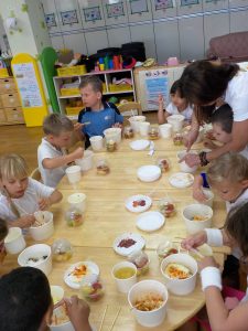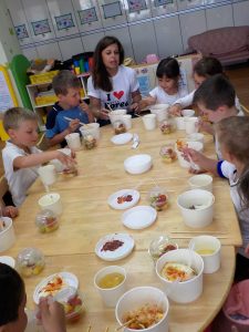 Nous avons dégusté dans la classe des maternelles un » Bibimbap » , des fruits frais et barres chocolatées.