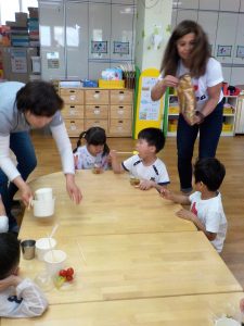 Puis les P’tits Loups et leurs camarades ont tourné sur les différents ateliers animés par les enseignants coréens. Les enfants coréens étaient accompagnés de leur parents.