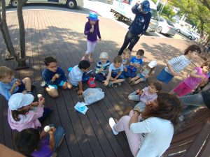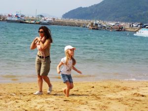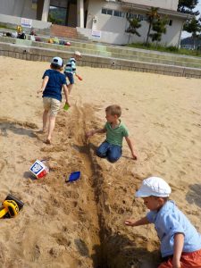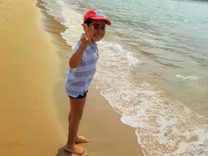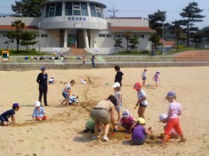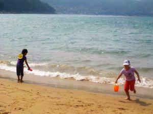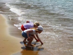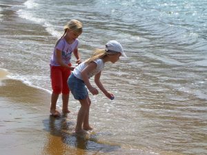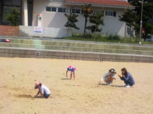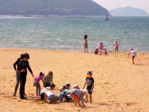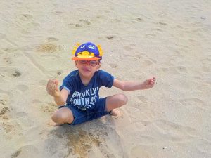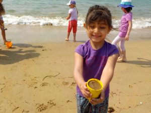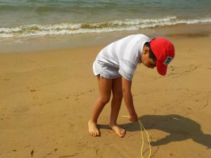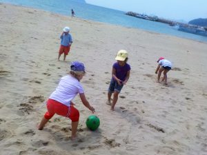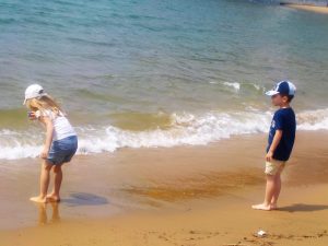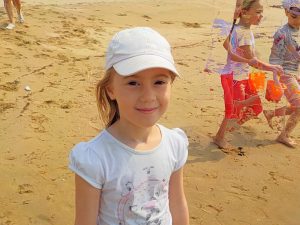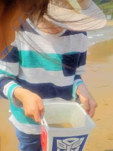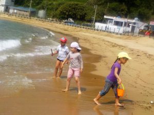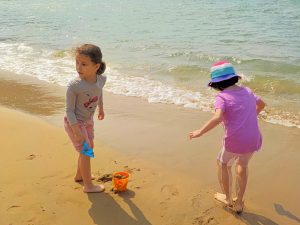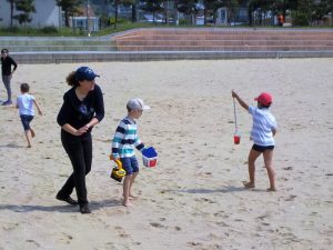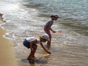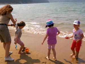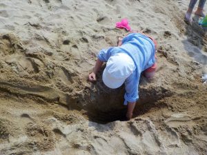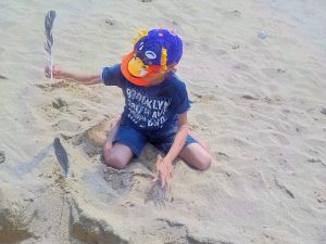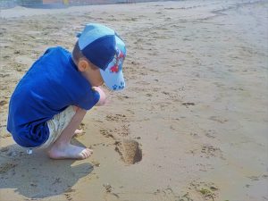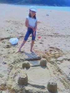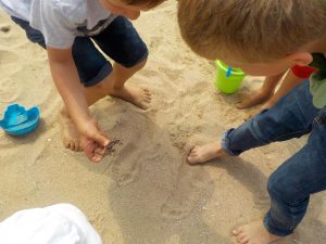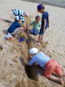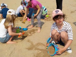 Jeux sur la plage : un chemin qui va jusqu’à la mer, châteaux de sable, ballon, frisby, fusée mousse… Puis un bon pique-nique vers 11H30.