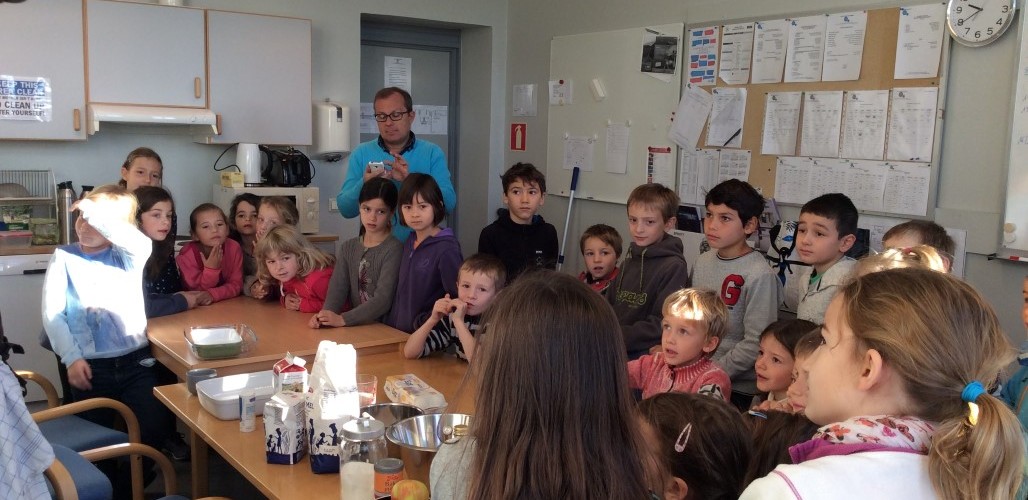 Jeudi, nous avons cuisiné avec François à l’école. Nous avons fait un clafoutis aux pommes et aux prunes puis une salade composée. Ensuite nous nous sommes bandé les yeux pour goûter des aliments et nous devions dire s’ils étaient amers, acides, sucrés ou salés. Pour le repas, nous avons mangé notre salade et notre gâteau. C’était délicieux.