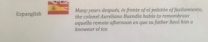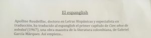 El Spanglish ( o spanglish) es un « idioma » formado a partir del español y de términos anglosajones, y es hablado por una mayoría de los 39 millones de hispanos que viven en los Estados Unidos. El espanglish se usa cada vez más en la tele, la radio, la música, la publicidad pero todavía es poco considerado en la literatura