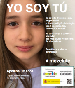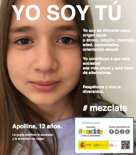 En su tarea final, Apolline aparece en uno de los carteles de la campaña de sensibilización « Mézclate » y participa en el concurso organizado por el Ministerio de Sanidad, Servicios Sociales e Igualdad. En su vídeo, Apolline ha sabido trascender el tema estudiado en clase para dirigirse a sus compañeros y hablar de un tema mucho más amplio: la diversidad y la aceptación del otro.