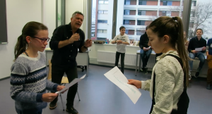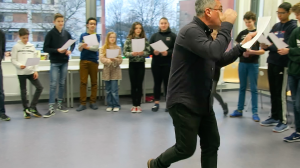 Les élèves ont réalisé des exercices théâtraux (placement de la colonne d’air, respirations, articulation) qui leur ont permis de se préparer aux répétitions de la pièce de théâtre Mangfold.