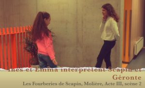 Le rideau s’ouvre aujourd’hui sur Emma, Inès, Lucie et Apolline qui deviennent, l’espace d’un instant, Géronte et Scapin.