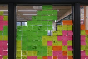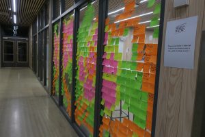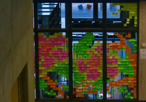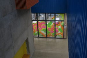 Après avoir rédigé son haïku, chaque enfant a dû le recopier douze fois sur des post-it colorés. Les élèves de l’atelier d’écriture, accompagnés de quelques camarades, ont ensuite déposé les huit cent cinquante post-it sur les vitres du CDI. Ils ont décidé de célébrer le printemps en reproduisant une branche de cerisier en fleurs, le « Sakura » grâce à la technique du Pixel Art.