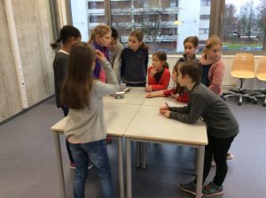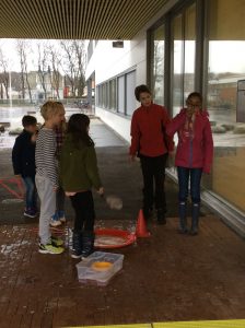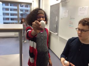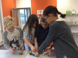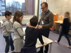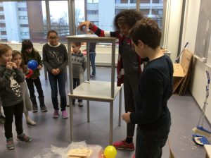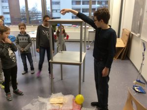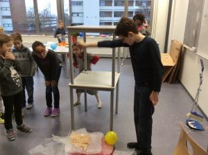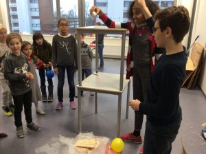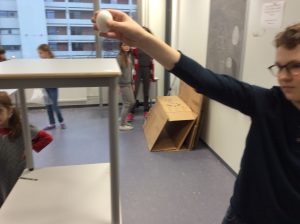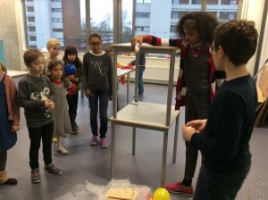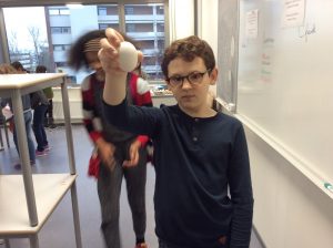 L’atelier « lâché d’œufs » fut une réussite totale. Les élèves l’ont beaucoup apprécié. Le fait qu’on puisse casser des œufs était très rigolo… Nous avons tous eu des responsabilités très différentes (traducteur, guide, accompagnateur, testeur). Les solutions techniques qui ont le plus fonctionnées, étaient celles où il fallait enfermer l’œuf dans une sorte de boîte. Cette solution est intéressante car elle permet à la fois d’amortir et de protéger l’œuf.
