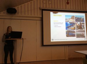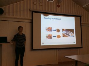 Nous avons d’abord assisté à une présentation de la société. Dans cette ferme, ils font des recherches sur l’alimentation des saumons. Ils les nourrissent avec des croquettes et expérimentent la composition des croquettes ainsi que la fréquence à laquelle nourrir les poissons pour une alimentation optimale.