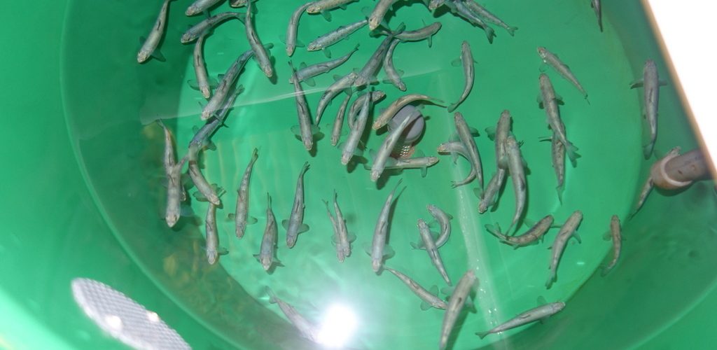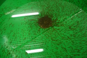 Avant d’atteindre l’âge adulte, les œufs et les alevins jusqu’à l’âge de 1 an vivent dans l’eau douce, prélevée dans la rivière. Ils sont à l’intérieur des bâtiments, placés dans des bacs spéciaux avec des distributeurs automatiques de mini croquettes ; les employés vérifient la température de l’eau et la santé des poissons.